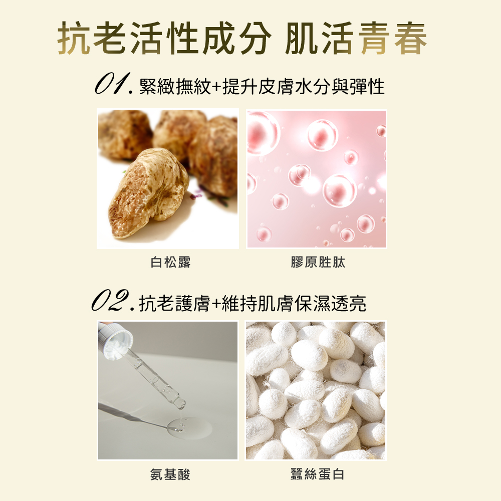 金箔、白松露、膠原胜肽、蠶絲蛋白、保濕氨基酸、傳明酸、蘆薈、洋甘菊